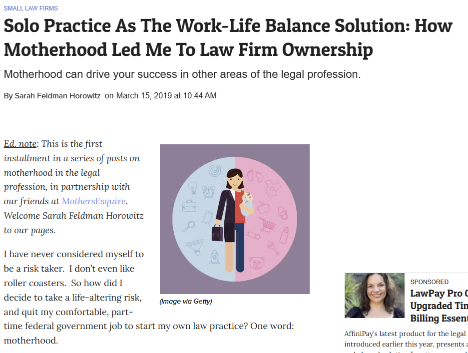 In the first installment in a series of posts on motherhood in the legal profession, our very own Sarah Horowitz writes about how motherhood led her to law firm ownership and solo practice.